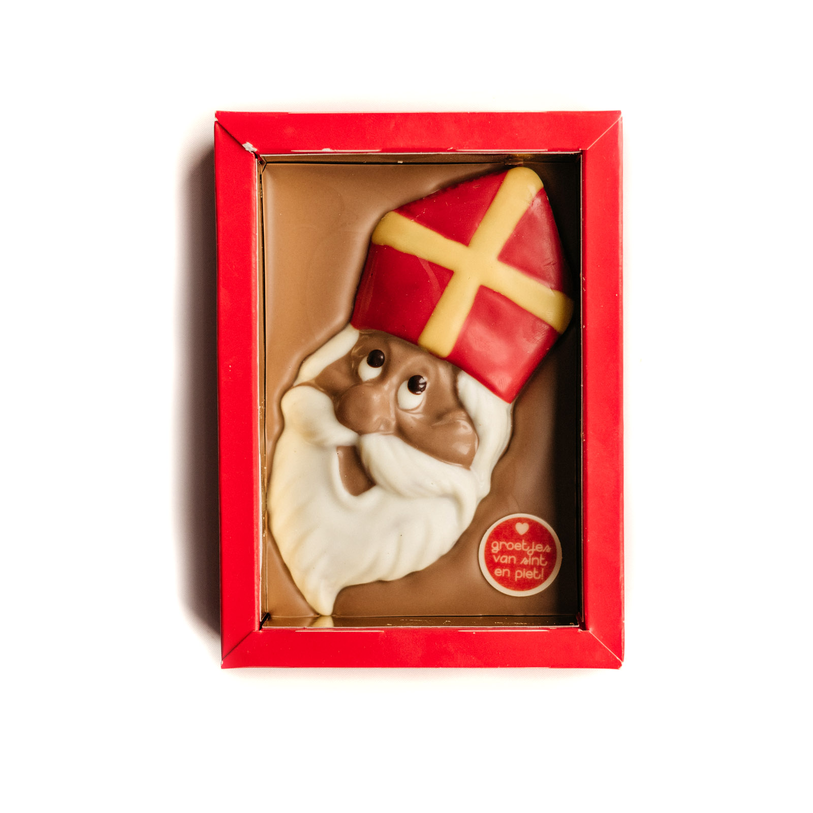 Chocolade Sinterklaas in vensterdoos. De luxe vensterdoos laat precies zien wat je geeft: een lekkere plak chocolade met het gezicht van Sinterklaas erop. Voor de plak chocolade heeft u keuze uit melk, wit of pure chocolade. De Sinterklaas is een combinatie van melk en witte chocolade en marsepein. Dankzij het A5-formaat past het cadeau moeiteloos door de brievenbus. Ideaal als attente verrassing voor familie, vrienden of collega’s, zonder dat iemand thuis hoeft te blijven.