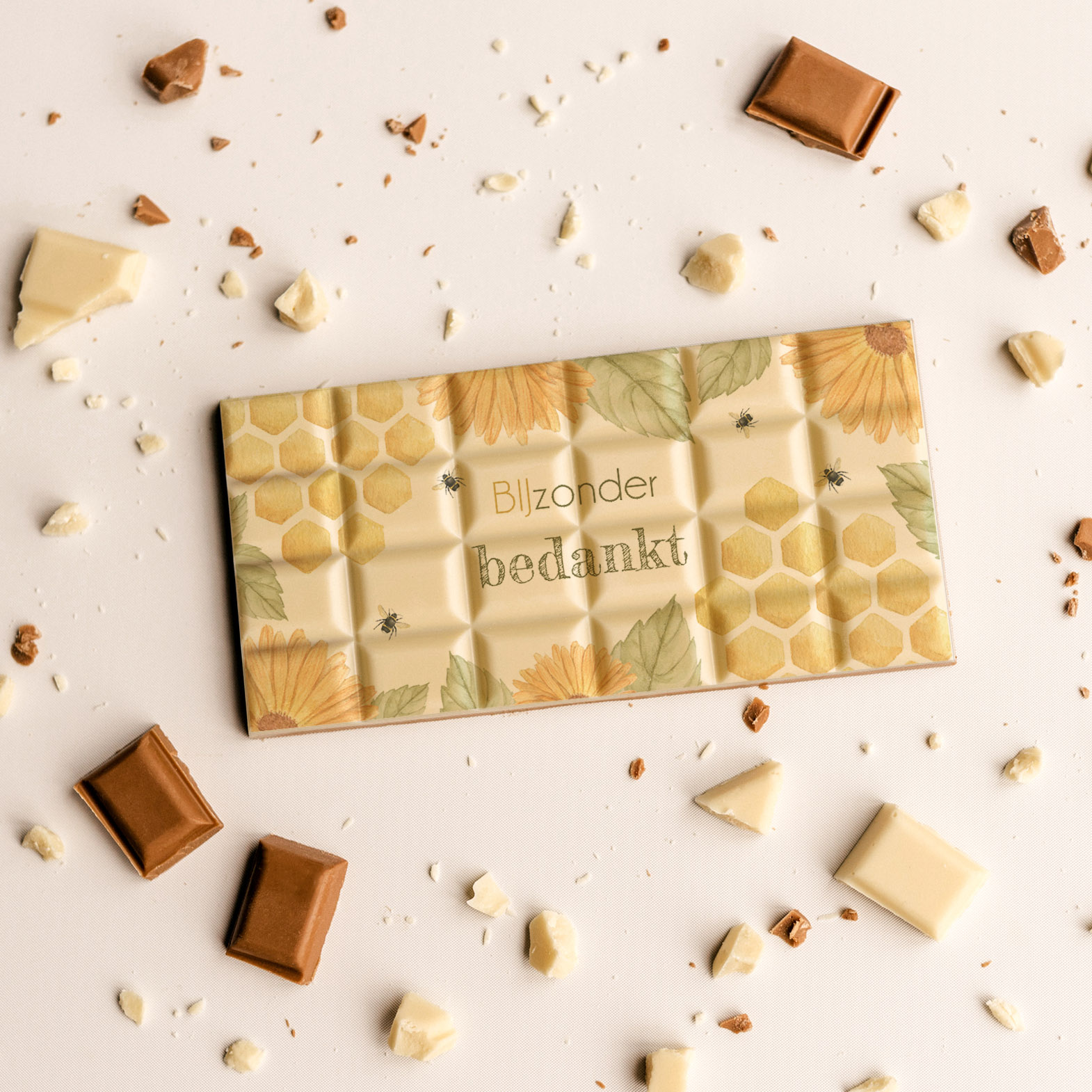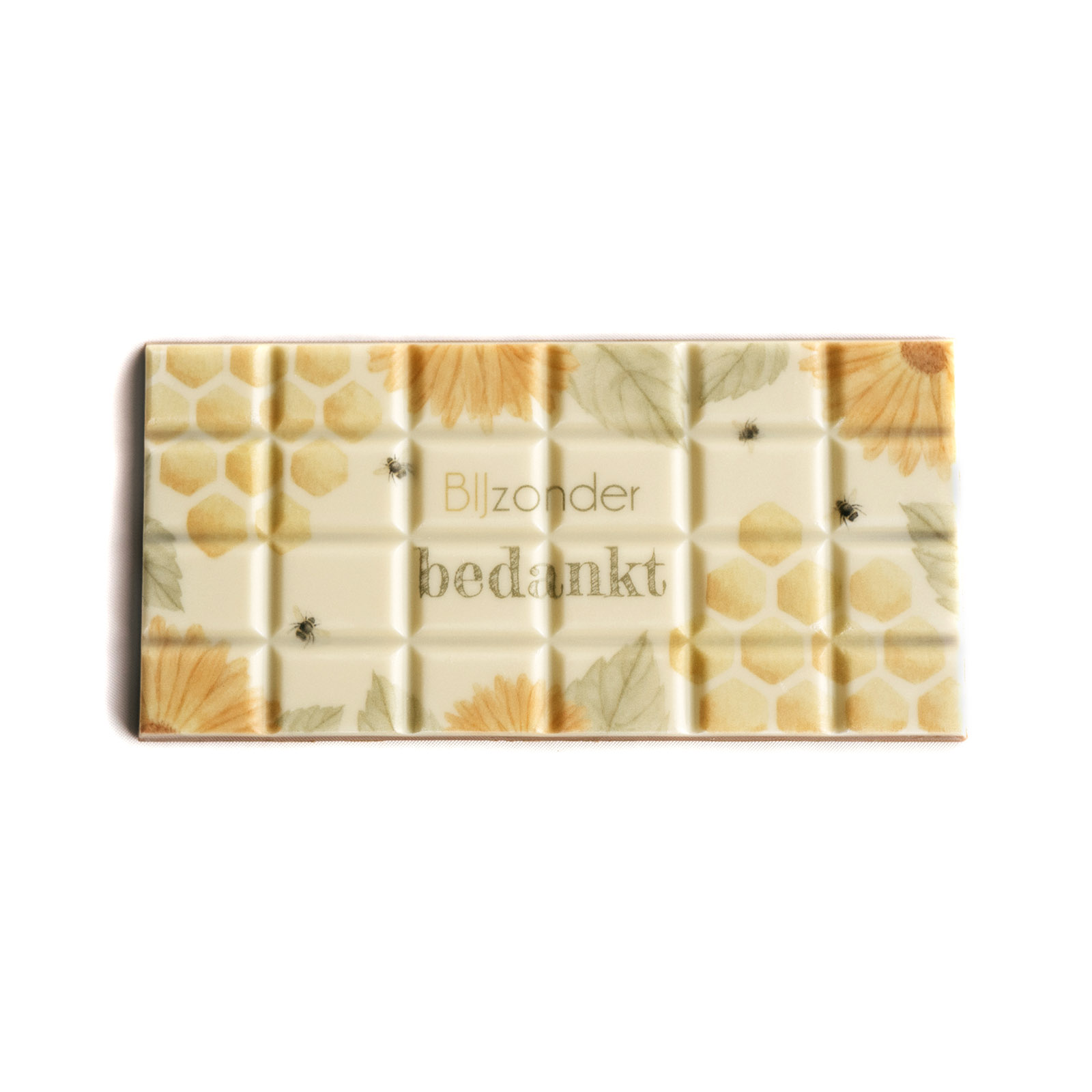 Chocoladereep bijzonder bedankt. Elke reep is een klein kunstwerk. Een romige chocoladereep met daarop een verfijnde, handgetekende waterverf illustratie die tot leven komt in zachte tinten. De hoogwaardige eetbare print wordt food-safe aangebracht, zodat de smaak én de tekening prachtig tot hun recht komen.