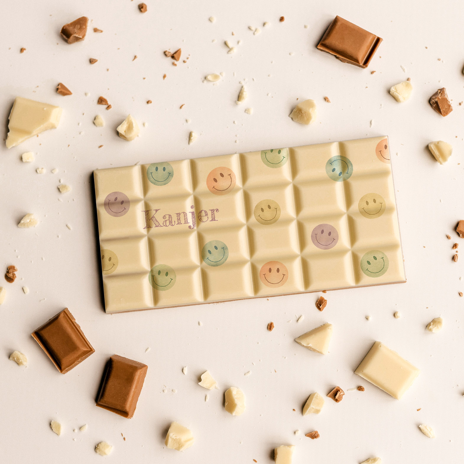 Chocoladereep kanjer. Elke reep is een klein kunstwerk. Een romige chocoladereep met daarop een verfijnde, handgetekende waterverf illustratie die tot leven komt in zachte tinten. De hoogwaardige eetbare print wordt food-safe aangebracht, zodat de smaak én de tekening prachtig tot hun recht komen.