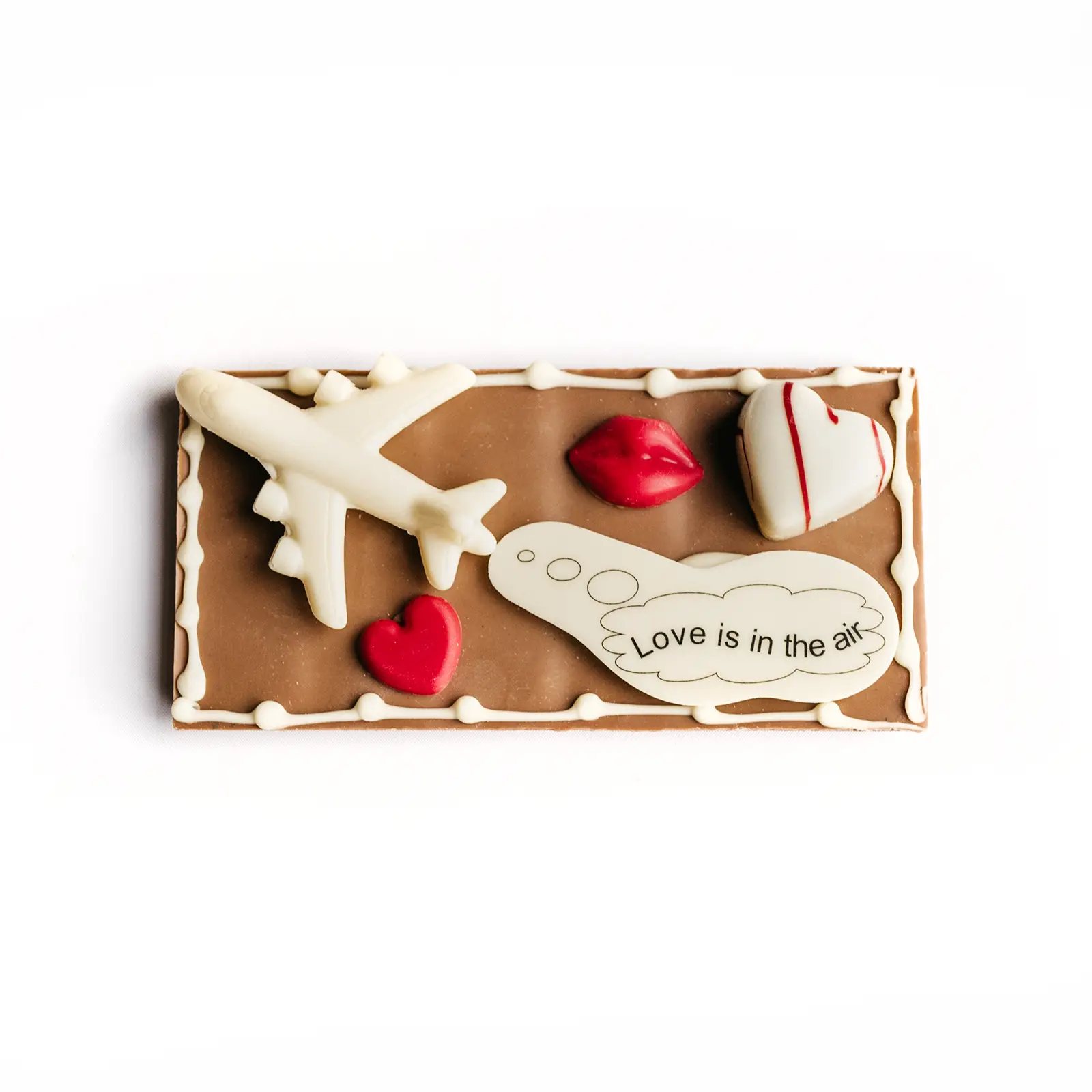 De liefde hangt in de lucht met dit leuke chocolade cadeau van circa 8 x 15 cm. De chocoladereep wordt gemaakt van melk chocolade. De chocoladereep wordt voorzien van massieve witte en rode chocolade hartjes/lipjes (witte chocolade met kleurstof) en een hartjes bonbon gevuld met een zachte hazelnoot praliné vulling. De chocoladereep wordt verpakt in cellofaan met twee strikjes aan de zijkanten.