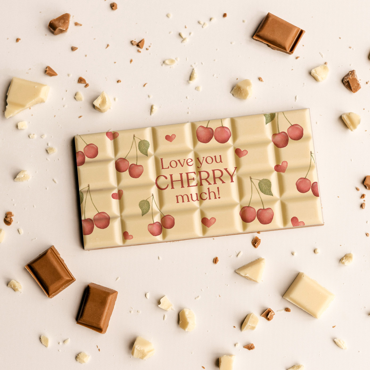 Chocoladereep love you cherry much. Elke reep is een klein kunstwerk. Een romige chocoladereep met daarop een verfijnde, handgetekende waterverf illustratie die tot leven komt in zachte tinten. De hoogwaardige eetbare print wordt food-safe aangebracht, zodat de smaak én de tekening prachtig tot hun recht komen.