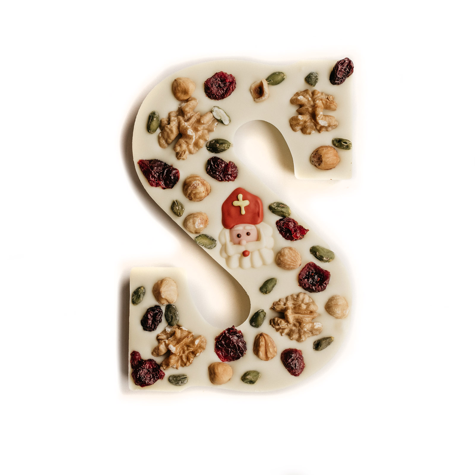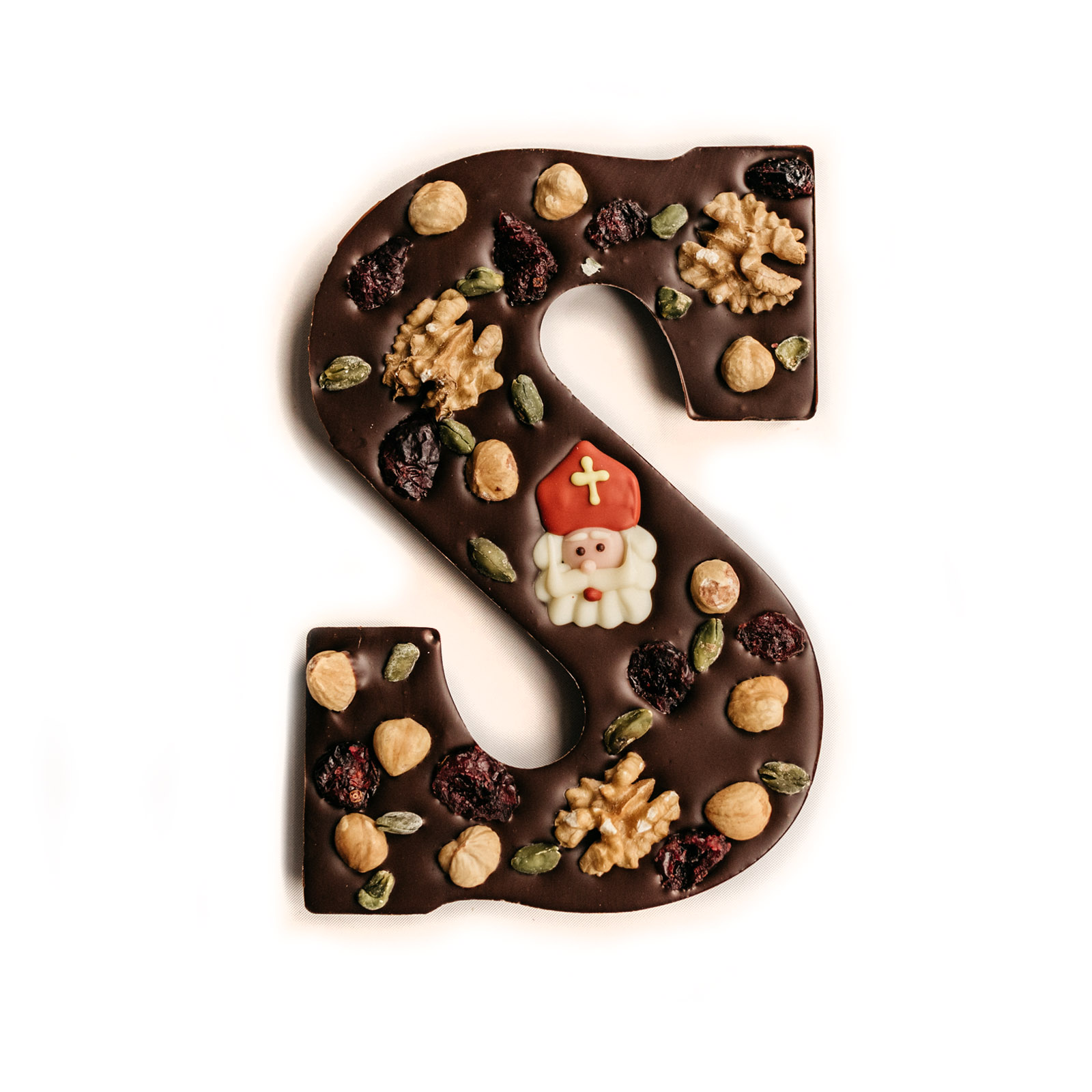 Een ambachtelijke gedecoreerde chocoladeletter met studentenhaver (bestaand uit pistachenootjes, walnoten, hazelnoten en cranberries) en een Sinterklaas decoratie. De chocoladeletter wordt omhuld met melk, wit of pure chocolade van Callebaut. De chocoladeletter weegt circa 230 gram (exclusief verpakking) en wordt verpakt in een chique Sinterklaas rode doos met transparant venster. Let op: dit soort chocoladeletter is alleen verkrijgbaar in de letter S.