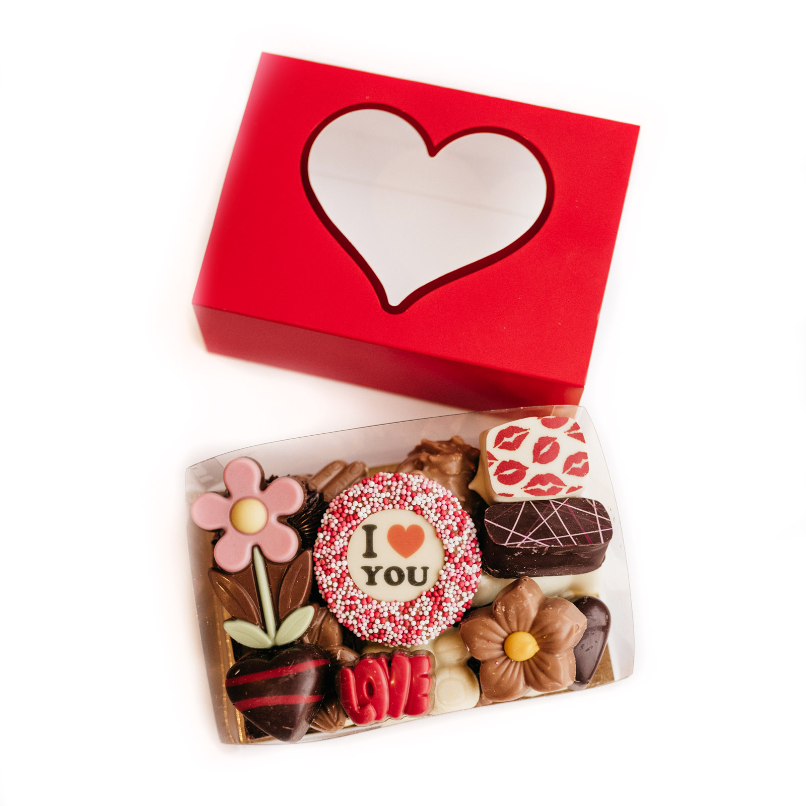 Hartjes cadeaubox gevuld met chocolade en bonbons. Verras met een lief & luxe cadeautje. Deze rode cadeaudoos met hartvenster is gevuld met een feestelijke mix van massieve chocolade en bonbons. Direct cadeau-klaar en perfect voor 14 februari of voor Moederdag.