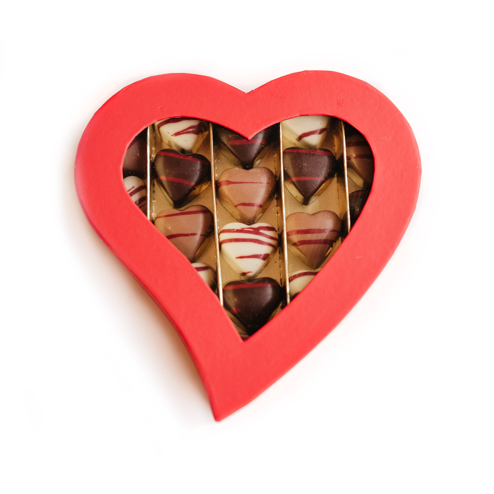 Zeg het in stijl met deze hartvormige bonbondoos met hartjes bonbons. Binnenin vind je 10 of 17 ambachtelijke hartbonbons in melk, puur en wit, met als vulling een zachte hazelnoot praliné. De goudkleurige inlay met vakverdeling houdt elk hartje perfect op z’n plek—chic, strak en direct cadeau-klaar.