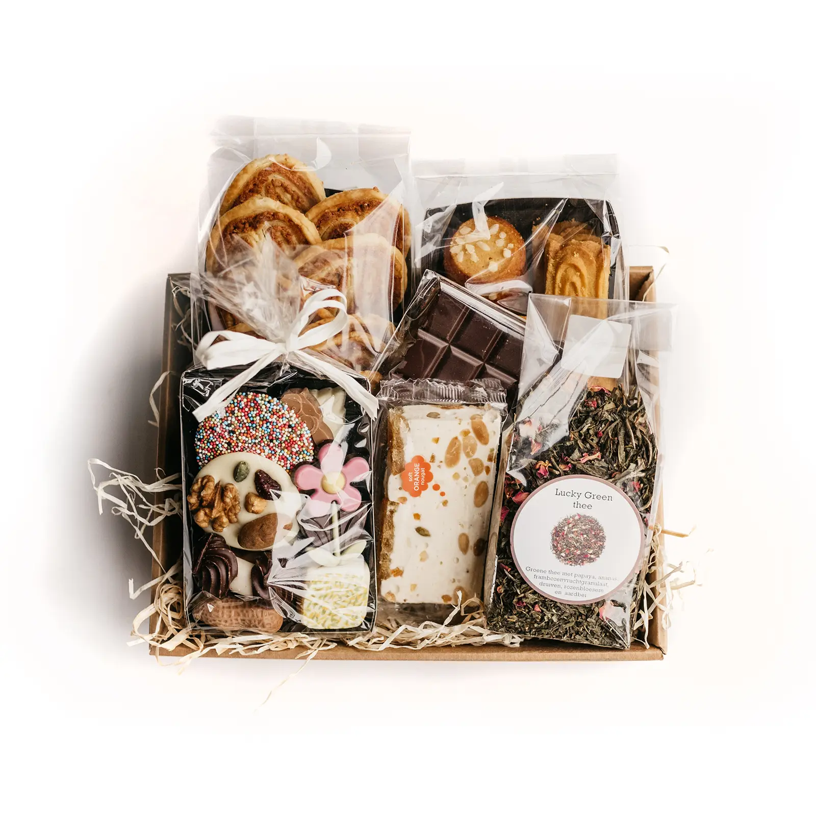 Een goed gevulde kartonnen cadeaubox met de tekst “het beste van de streek” aan de voorzijde. De cadeaubox is gevuld met kaasvlinders (circa 150 gram), een chocolade assortiment (200 gram), een chocoladereep (keuze uit melk, wit of puur 100 gram), verse thee, roomboterkoekjes (150 gram) en een stukje noga. Alle koekjes en chocolade producten worden vervaardigd in eigen chocolaterie/bakkerij van onze andere onderneming “Chocolaterie-Patisserie-Glacerie LuuX”.