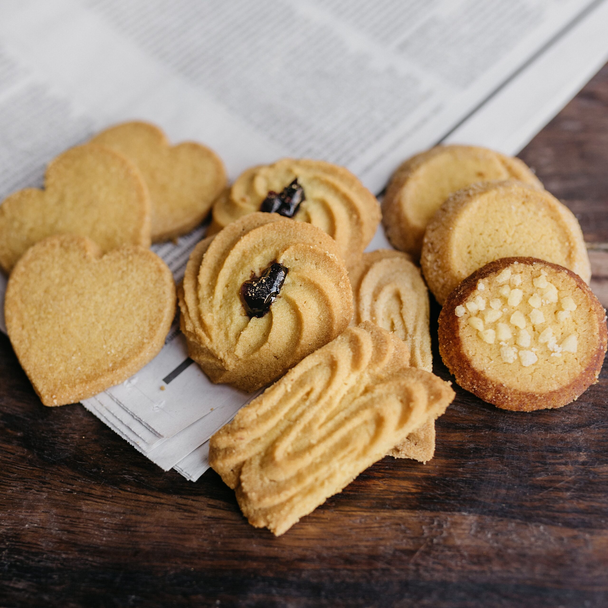 Houten tray klein met chocolade, koekjes en smoothie: een goed gevuld houten dienblad met handvaten met kaasvlinders (circa 125 gram), chocoladeassortiment (200 gram), roomboterkoekjes (150 gram) en een smoothie (200 ml).