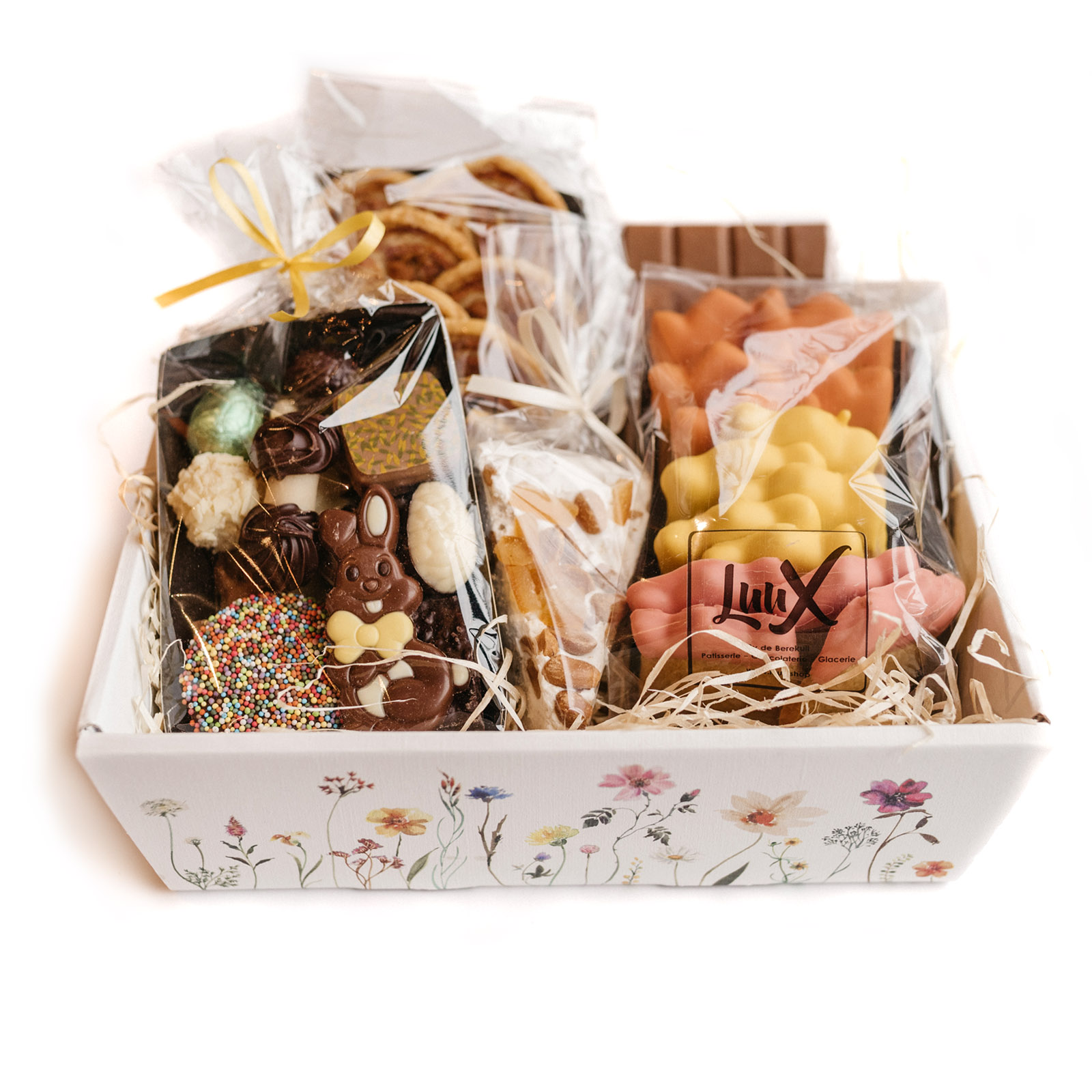 Vier het voorjaar met dit rijkgevulde Lenteverwenpakket – Klein. Een feestelijk cadeaupakket vol heerlijke lekkernijen om van te genieten of om iemand mee te verrassen. In dit pakket vind je een gevarieerde selectie aan specialiteiten waaronder, kaasvlinders (circa 125 gram), een melk chocoladereep (100 gram), chocoladeassortiment (200 gram), roomboter tulpenkoekjes gedipt in de chocolade (200 gram) en een stukje noga (circa 120 gram).